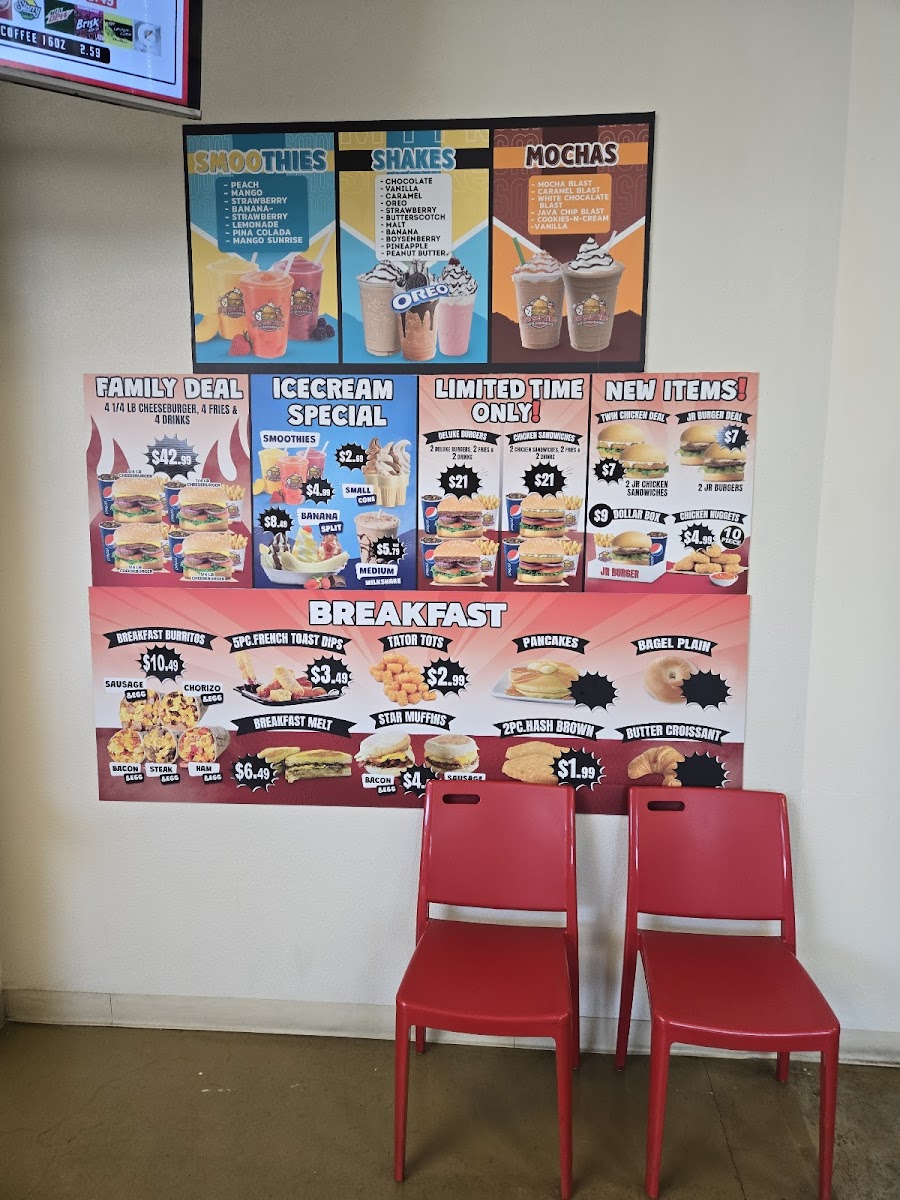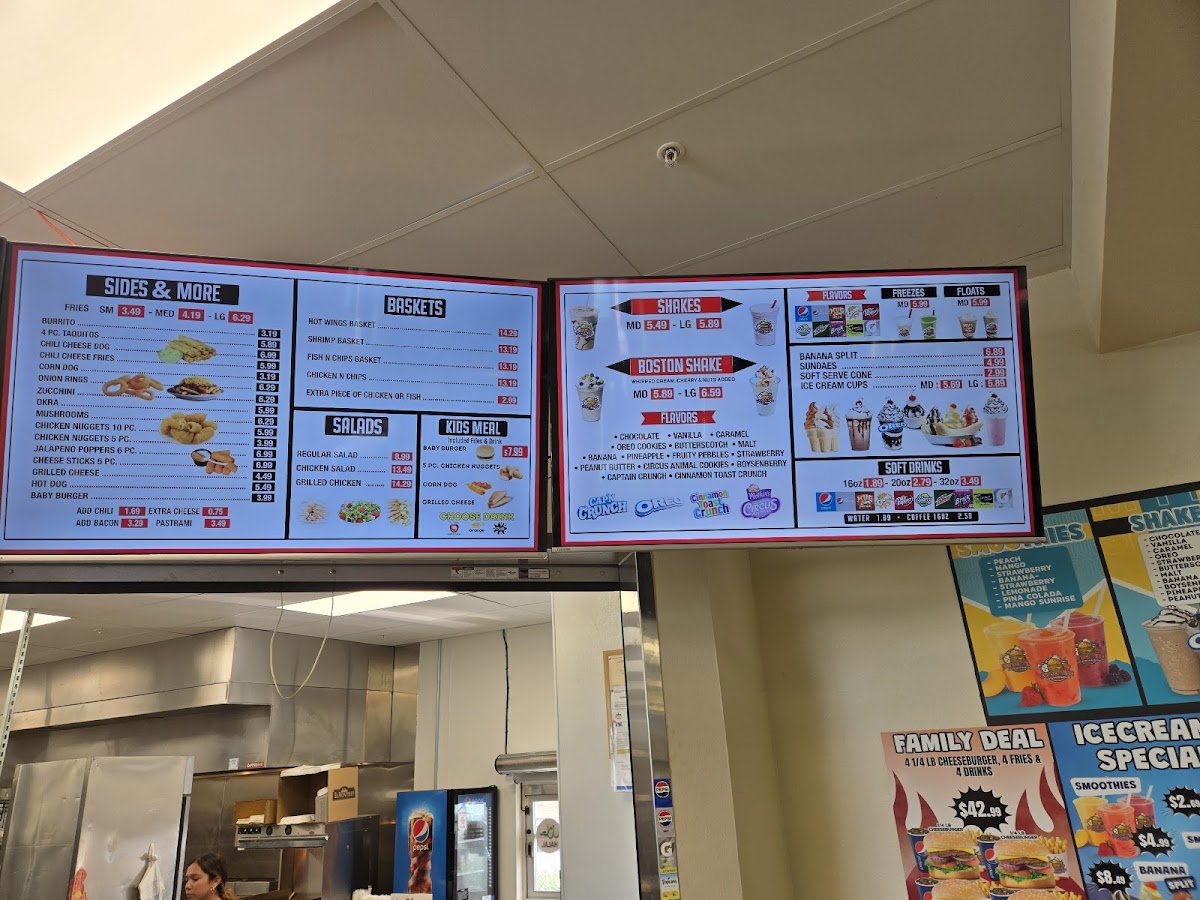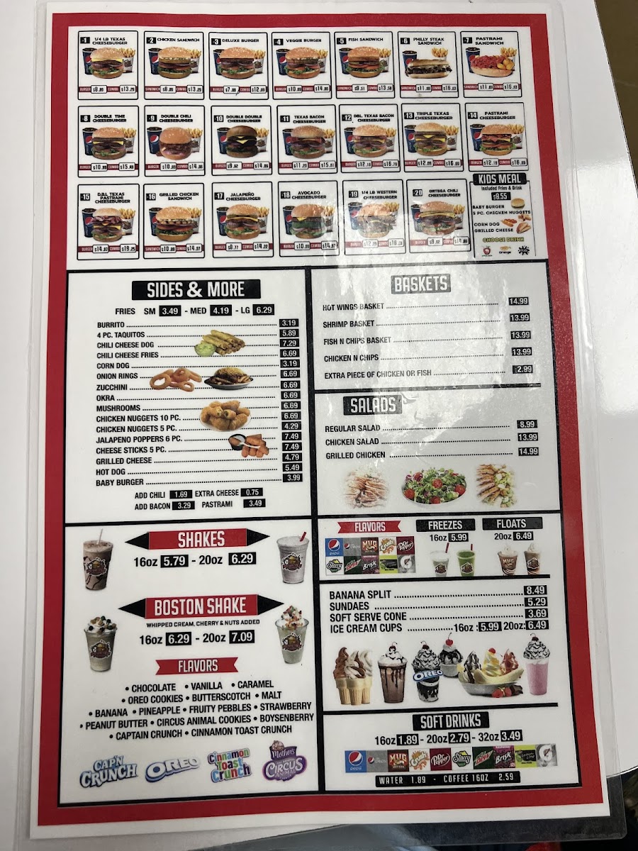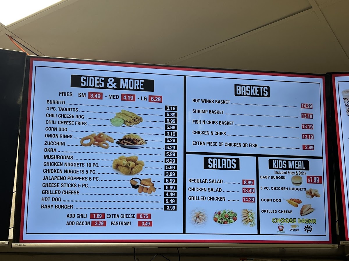 From a reviewer’s perspective, the menu at Burger Time offers a satisfying mix of classic comfort food at approachable prices, even though specific costs aren’t listed. The burger lineup stands out, especially the 1/4 Lb Texas Cheeseburger and the hearty Double Texas Bacon Cheeseburger, while the Chicken Sandwich and Deluxe Burger provide solid alternatives. Combo options like the Texas Bacon Cheeseburger Combo and Deluxe Burger Combo make meals more complete and convenient. For families, the kids’ selections-such as the Kids Meal Baby Burger and Kids Meal 5 Piece Chicken Nuggets-are simple and appealing. Sides like Fries, Chili Cheese Fries, and the Chili Cheese Dog complement the mains well, while baskets such as the Fish N Chips Basket and Shrimp Basket add variety for those wanting more than burgers. Lighter options like the Grilled Chicken Salad balance out the menu, and dessert choices-including Milkshakes, Banana Split, and Boston Shake-round out the experience nicely. Value-driven offerings like the Family Deal (4 1/4 Lb Cheeseburger, 4 Fries & 4 Drinks) and limited-time bundles such as 2 Deluxe Burgers, 2 Fries & 2 Drinks make it especially appealing for groups. Overall, Burger Time delivers a well-rounded, classic American fast-food menu with enough variety to satisfy different cravings.
